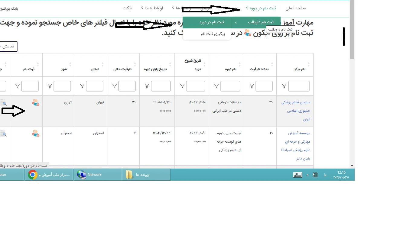 سپس از بخش ثبت نام داوطلب و سپس ثبت نام دوره ، دوره آموزشی سازمان نظام پزشکی را یافته و سپس از بخش ثبت نام به صفحه تکمیل فرم مربوطه مراجعه و آنرا تکمیل و ارسال نمایید: